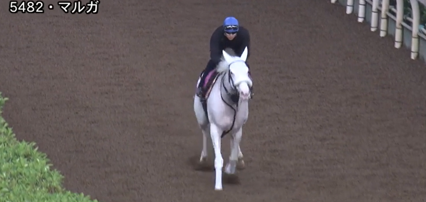 函館芝1800m戦の2歳レコードを更新したマルガは武豊騎手を背に坂路で15.1-14.1-13.0-12.2というラップを刻む。