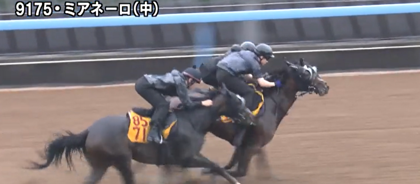 ヴィクトリアマイルを取り消して仕切り直しの一戦となるミアネーロも3頭併せの真ん中でビシッと追われる意欲的な追い切りを消化。