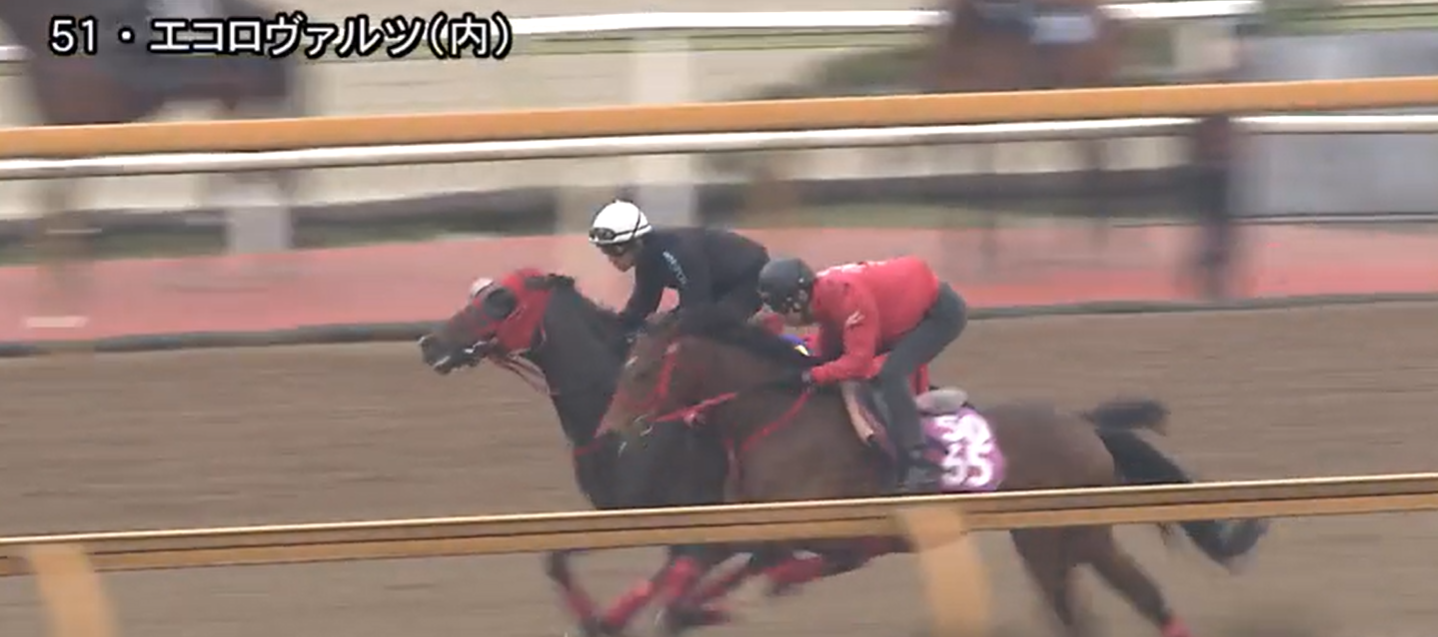 中山記念3着のエコロヴァルツは浜中騎手を背にコースでの併せ馬。