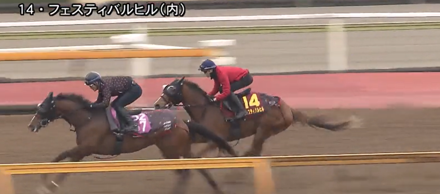 骨折休養明け初戦となるフェスティバルヒルは坂井騎手を背にコースでの併せ馬。