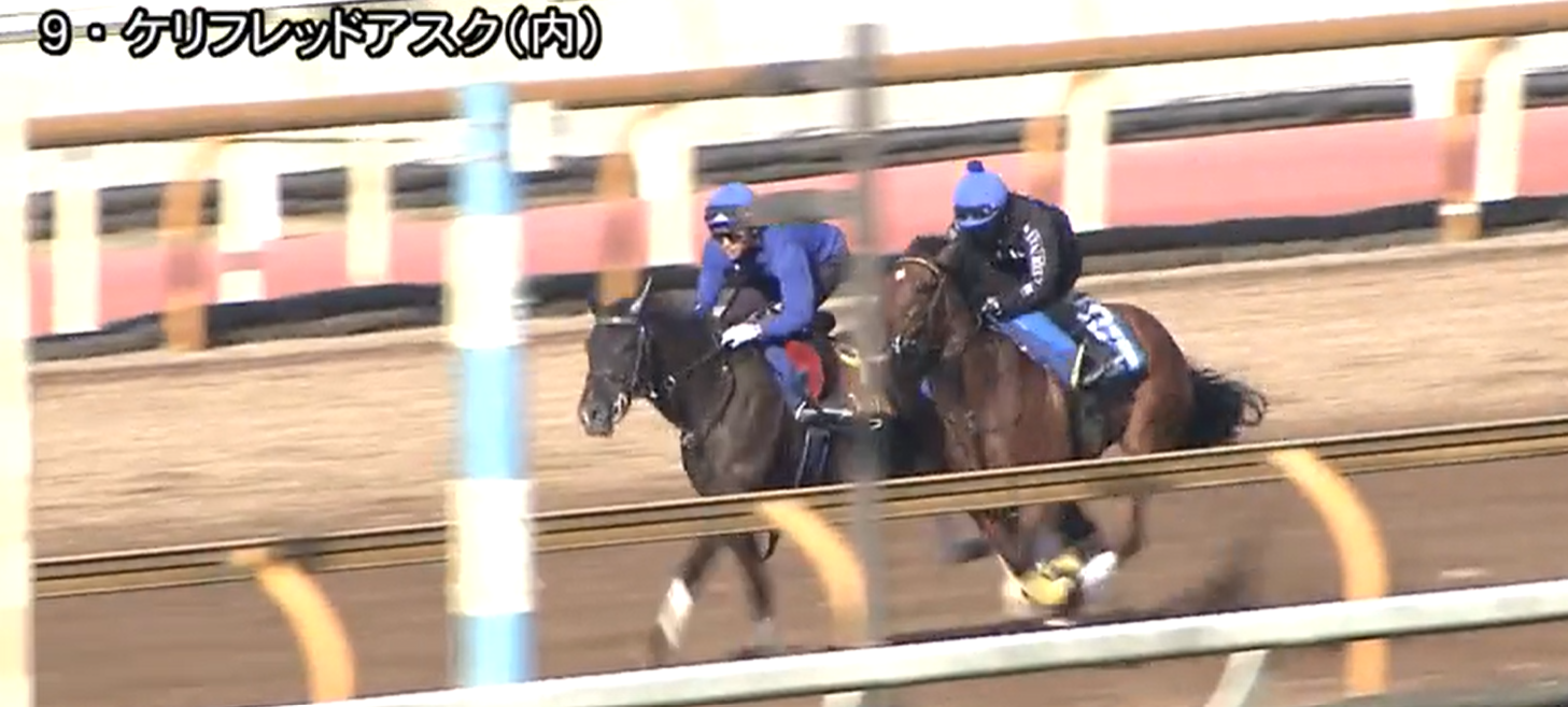 紫苑ステークスの勝ち馬ケリフレッドアスクは西塚騎手を背にコースでの併せ馬。
